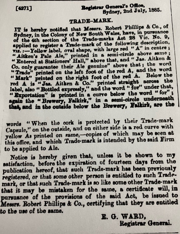 Aitken’s created an ale that was designed to endure the long sea voyage to Australia and arrive in perfect condition with no sediment. In 1885 the legal firm of Messrs. Robert Phillip & Co of Sydney applied to register a trade-mark with the following description: “A label, circular in shape, with an outside ring of white, then a thicker line of red and narrow ring of white, within the circle a boy is swimming and holding a lifebuoy with “Aitken’s Pale Ale” written on it.” Other trademarks were arranged by the same law firm and announced in the New South Wales Government Gazette (3 July 1885).